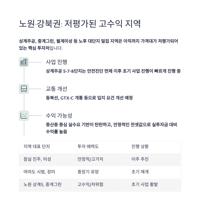| 노원 | 상계5, 중계그린 | 고수익/저위험 | 초기 사업 활발 |