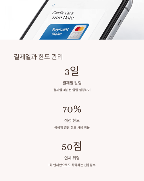 결제일과 한도를 철저히 관리해야 신용 점수를 지킬 수 있습니다.