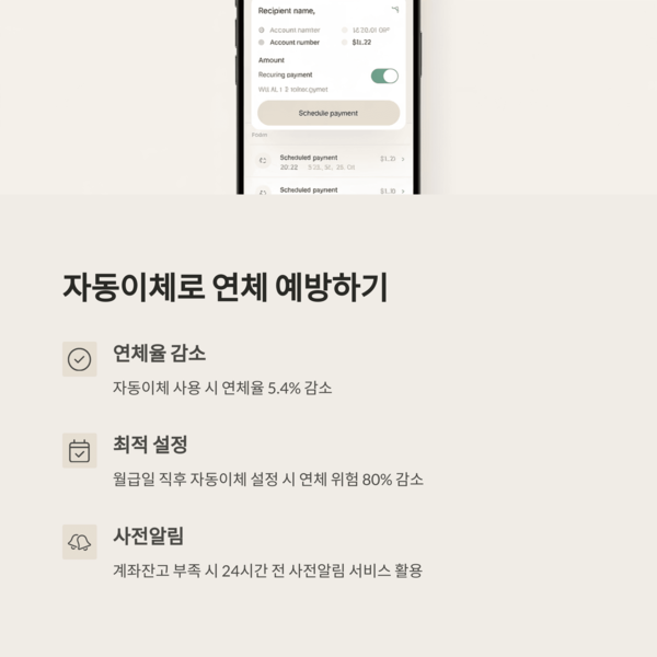 자동이체만 제대로 설정해도 연체 위험을 90% 이상 줄일 수 있습니다.
