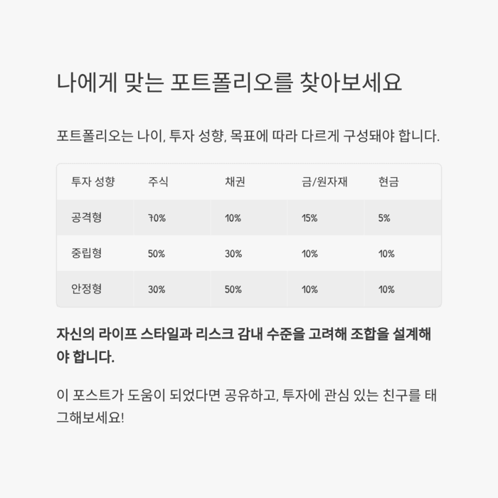 포트폴리오는 나이, 투자 성향, 목표에 따라 다르게 구성돼야 합니다.