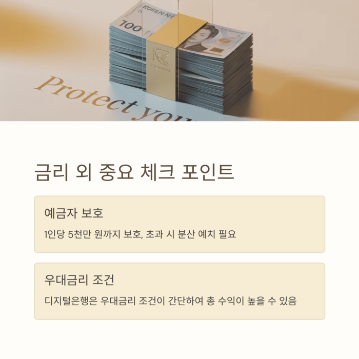 "예금 금리는 중요하지만 유동성, 중도 해지 조건, 예금자 보호 등을 반드시 확인해야 합니다."